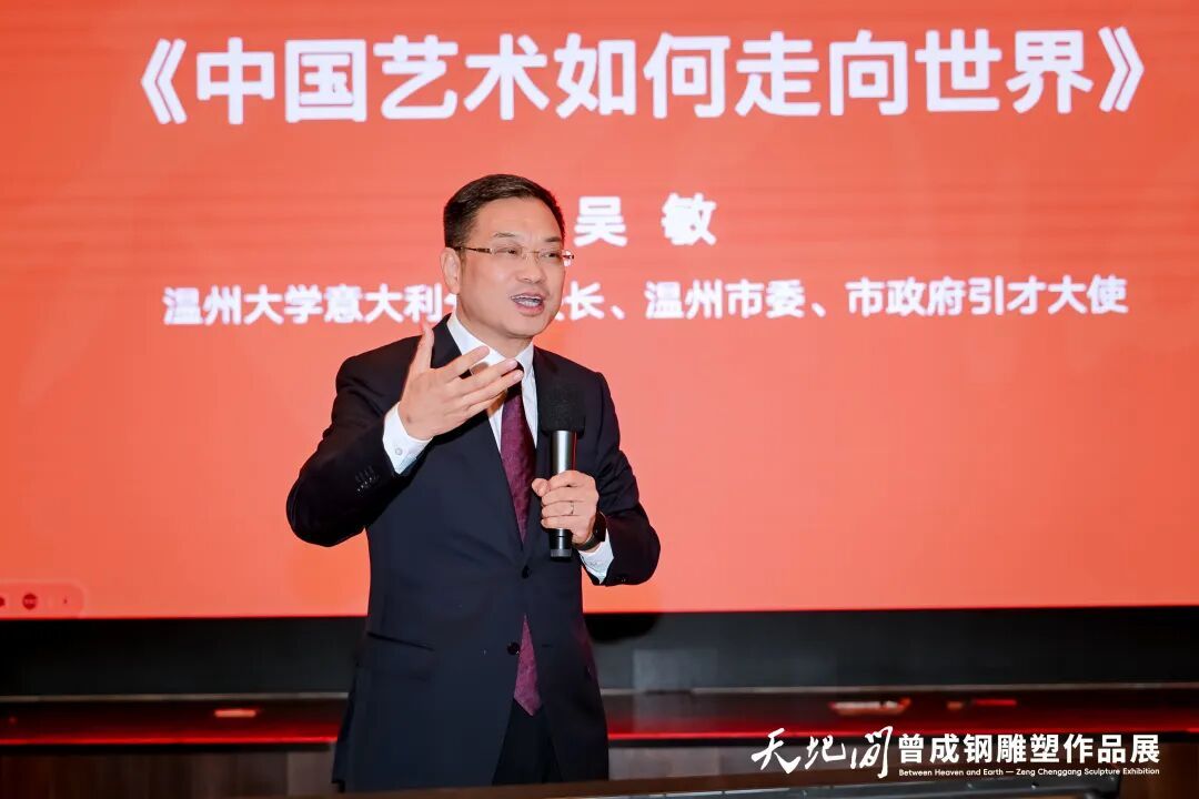 本校讯(记者 周瑶)1月22日,“天地间・曾成钢雕塑作品展” 在上海美术馆(中华艺术宫)开幕。温州大学意大利分校校长、温州市委、市政府引才大使吴敏受邀以“一带一路” 丝路学院系列专题——《中国艺术如何走向世界》发表演讲。来自文化和旅游部、上海市人民政府、中国文学艺术界联合会、清华大学、中国美术家协会等单位的相关负责同志出席开幕式。全国各大艺术院校领导、艺术机构专家、国内外雕塑界人士及社会各界嘉宾共 400 余人参加开幕式。